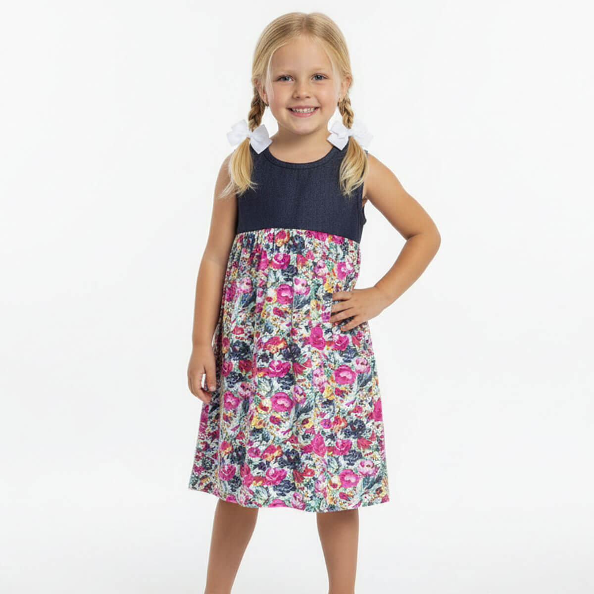 Vestido con pechera en jean camisero elastizado y falda de devoré estampado floreado