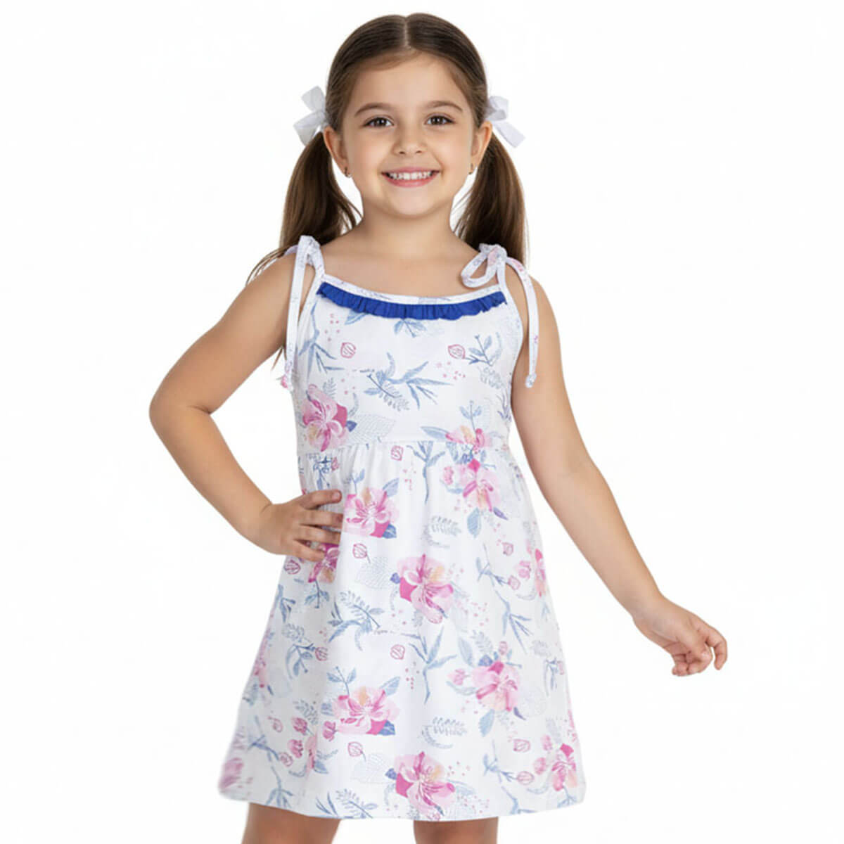 Vestido jersey estampado con breteles ajustables y volados en el frente.